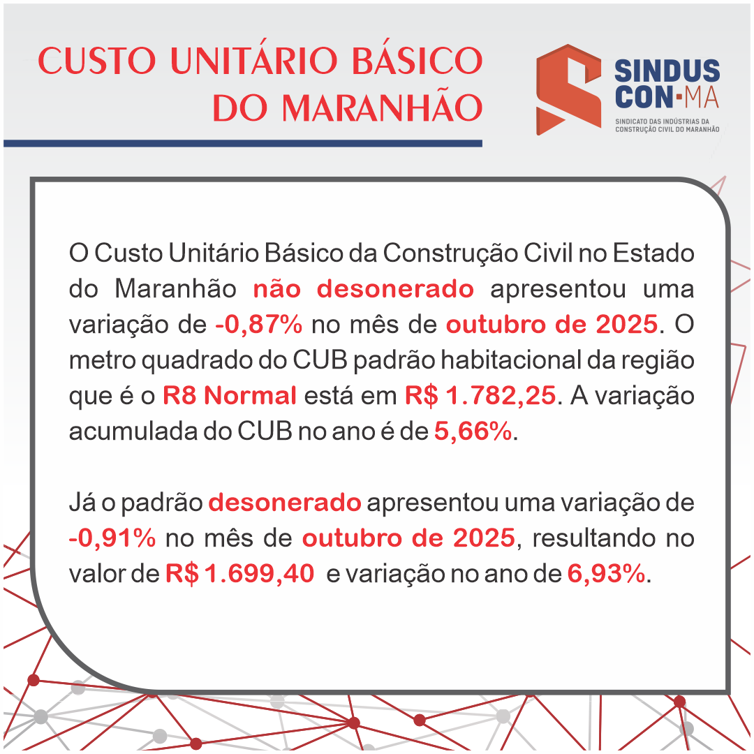 Implantado no SindusCon/MA em 1996, O CUB representa um custo parcial da obra, não levando em conta o valor do terreno, de elevadores, fundações especiais, instalações prediais (água, luz e esgoto, telefonia), remuneração de engenharia, publicidade, etc, sendo calculados com base em projetos-padrão representativos (1, 4, 8 ou 12 pavimentos; 2 ou 3 quartos; acabamentos baixo, normal e alto) a partir de lotes básicos de insumos (materiais, mão de obra e equipamentos) e seus respectivos pesos, definidos pela NBR-12721/93, da Associação Brasileira de Normas Técnicas – ABNT.